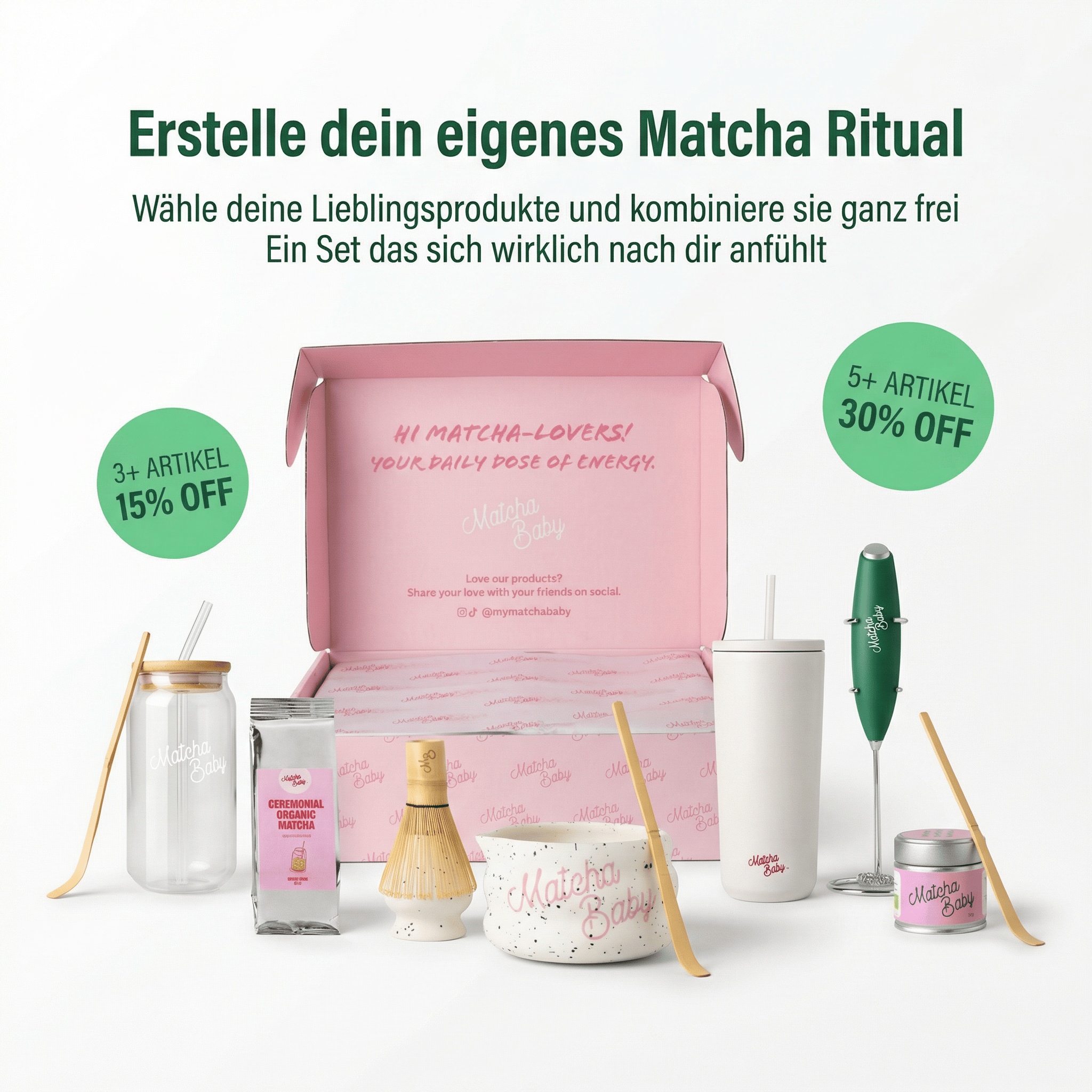 Das Matcha Pulver von Matcha Baby ist vielseitig einsetzbar und kann auf verschiedene Arten genossen werden. Du kannst es als traditionellen Matcha-Tee zubereiten, indem du das Pulver wie folgt mit heißem Wasser aufschäumst: Zubereitung: 1 Teelöffel Matcha in ein Glas geben, 30 ml Wasser ergänzen und mit Hilfe von unserem Schäumer in sekundenschnelle cremig rühren. Auf unserem Blog findest du leckere Rezepte, die dir zeigen, wie vielseitig Matcha sein kann.