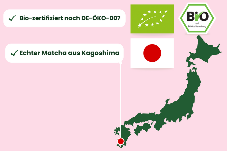 Our matcha is made from high-quality green tea from Kagoshima, Japan. Additionally, our matcha meets strict regulations and is certified organic according to DE-ÖKO-007.